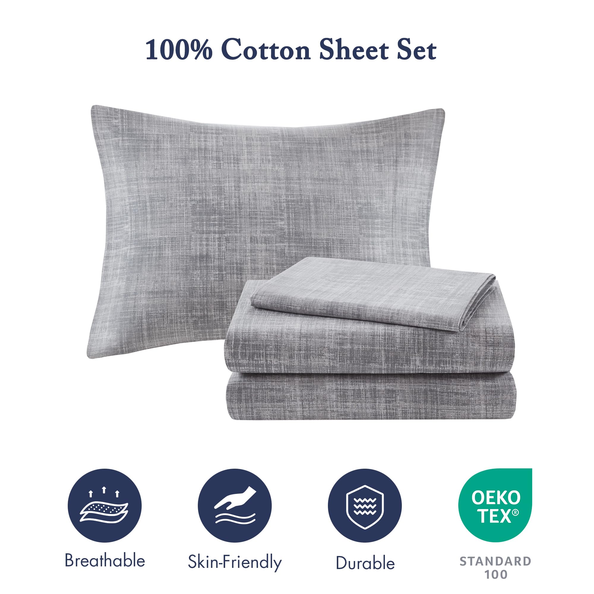 - Comforter is made of microfiber fabric, while Sheet set is made of 100% cotton. They are Oeko Tex Certified for not having any harmful chemical substance.