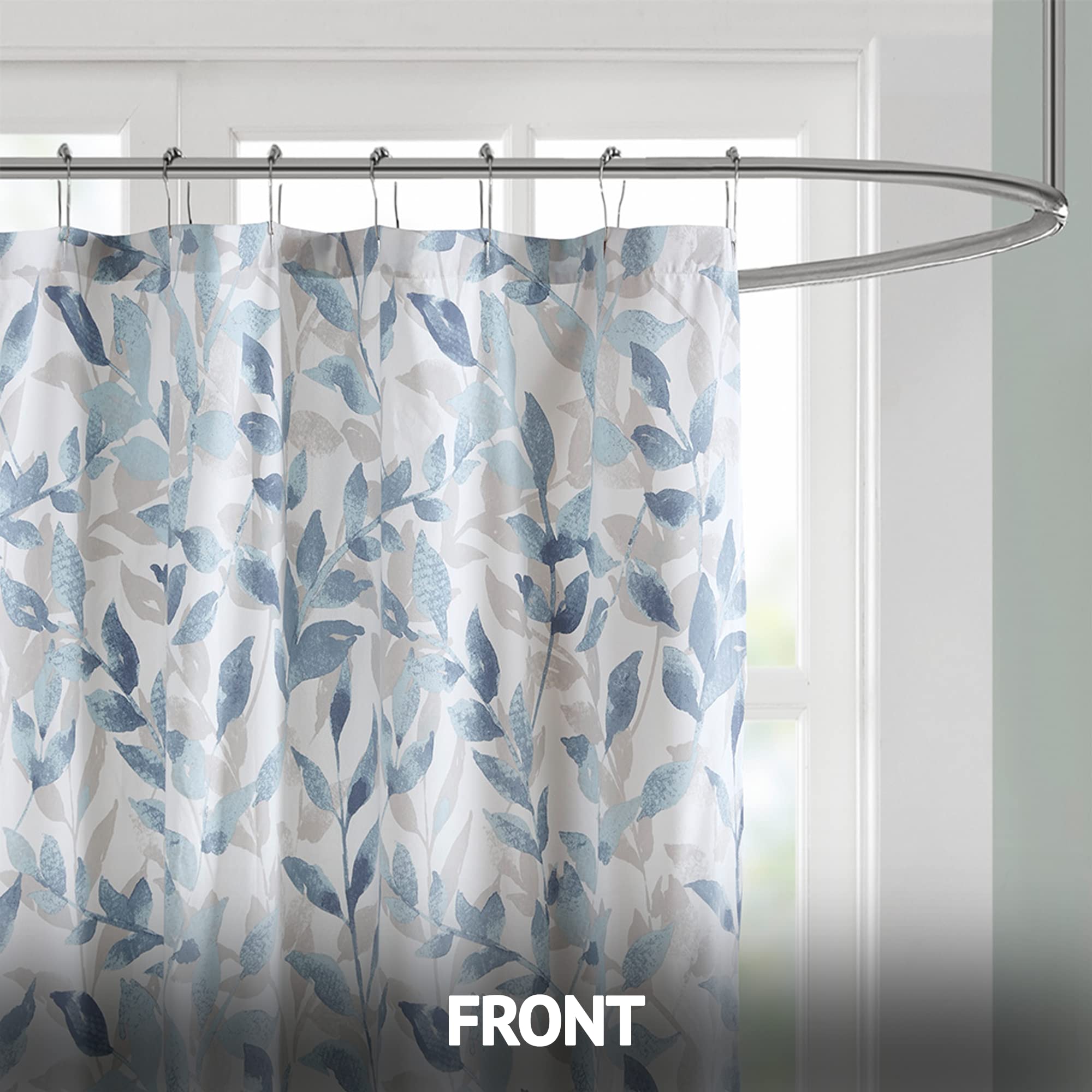 - This shower curtain features a botanical leaf print in soft, cool-toned shades of blue ranging from pastel to slate and subtle gray accents on a crisp white ground, providing a calming touch for your own peaceful retreat.