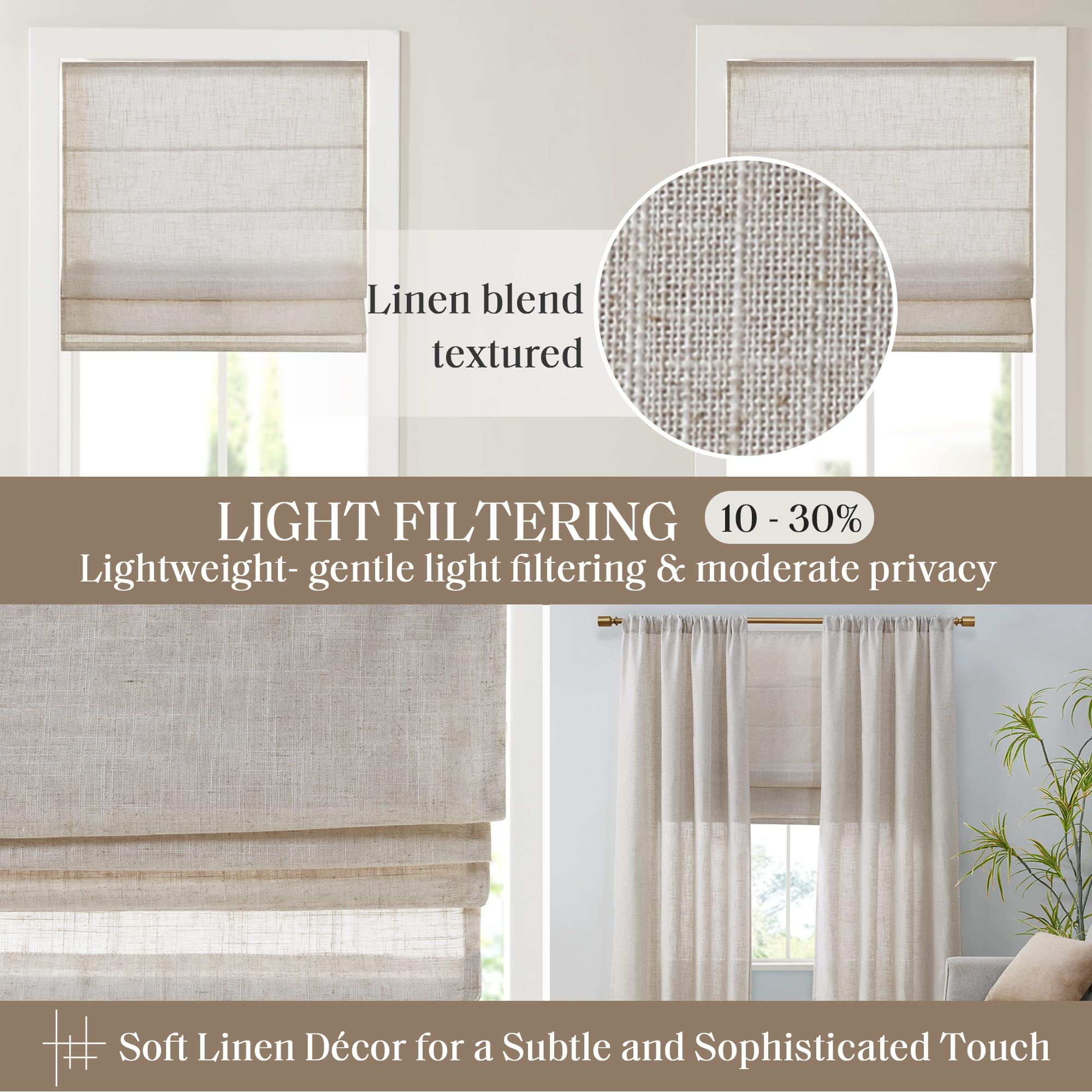 - This roman shade features a beautifully textured linen blend fabric in a soft white tone creating a natural look and feel, while the lightweight fabric lets the right amount of light into your home for a bright, yet soft and airy touch