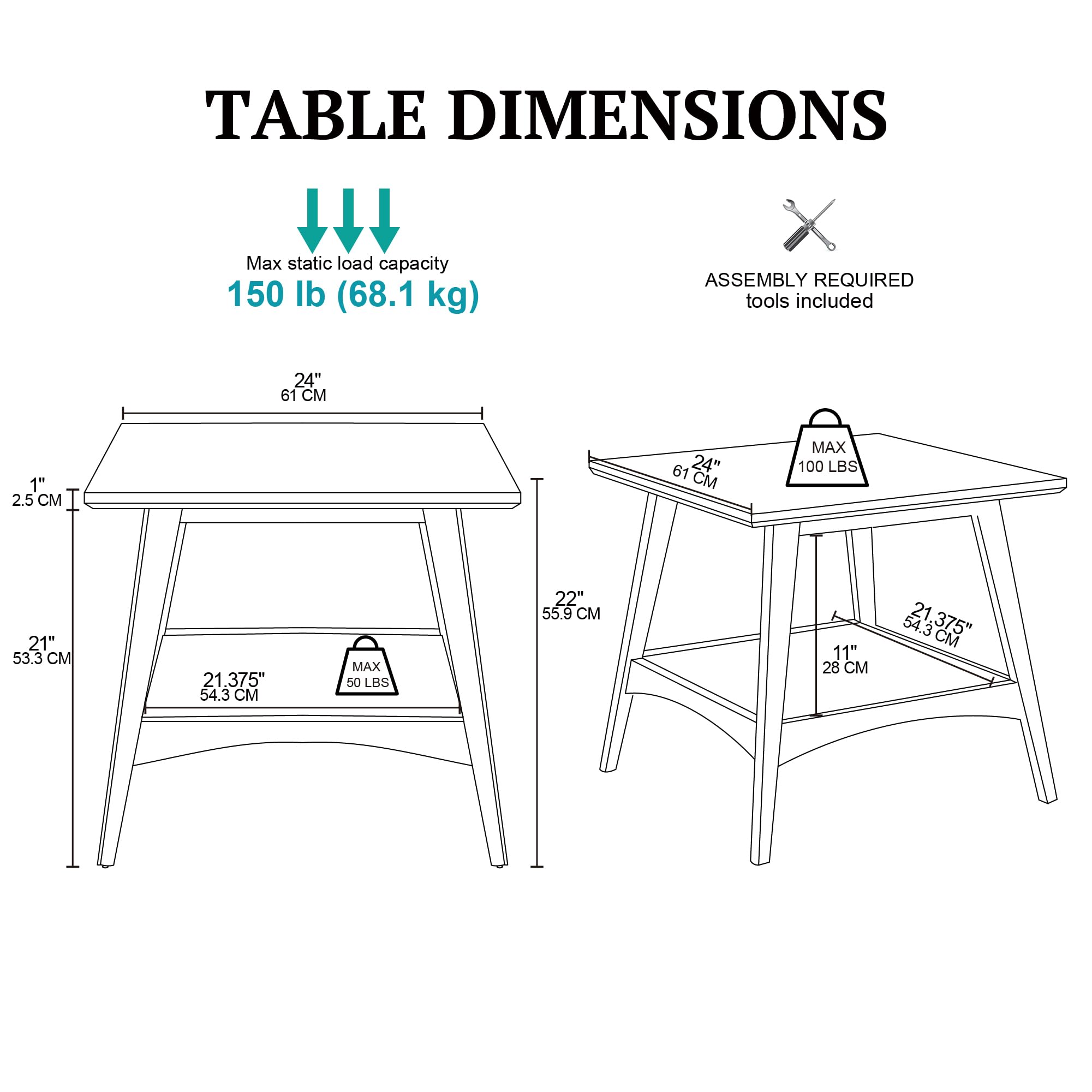 - PRODUCT MEASUREMENT - End Table:24"W x 24"D x 22"H. Table Top Size:24"W x 24"D x 1"T. Shelf Size:21.375"W x 21.375"D x 0.625"H. Shelf Distance:11"H. Maximum Weight Capacity:85LBS; assembly required