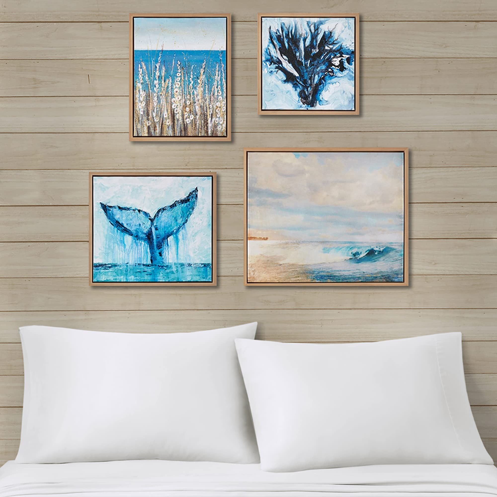 - FEATURES - High quality smooth rolled gel coated canvas for glossy finish which also protects the colors from fading.A complete set of coastal theme art wall décor arrangement.The set is great for hanging together displaying different pictures of oceanic landscape, a submerging whale tail, overlooking beach view, and abstract ocean view