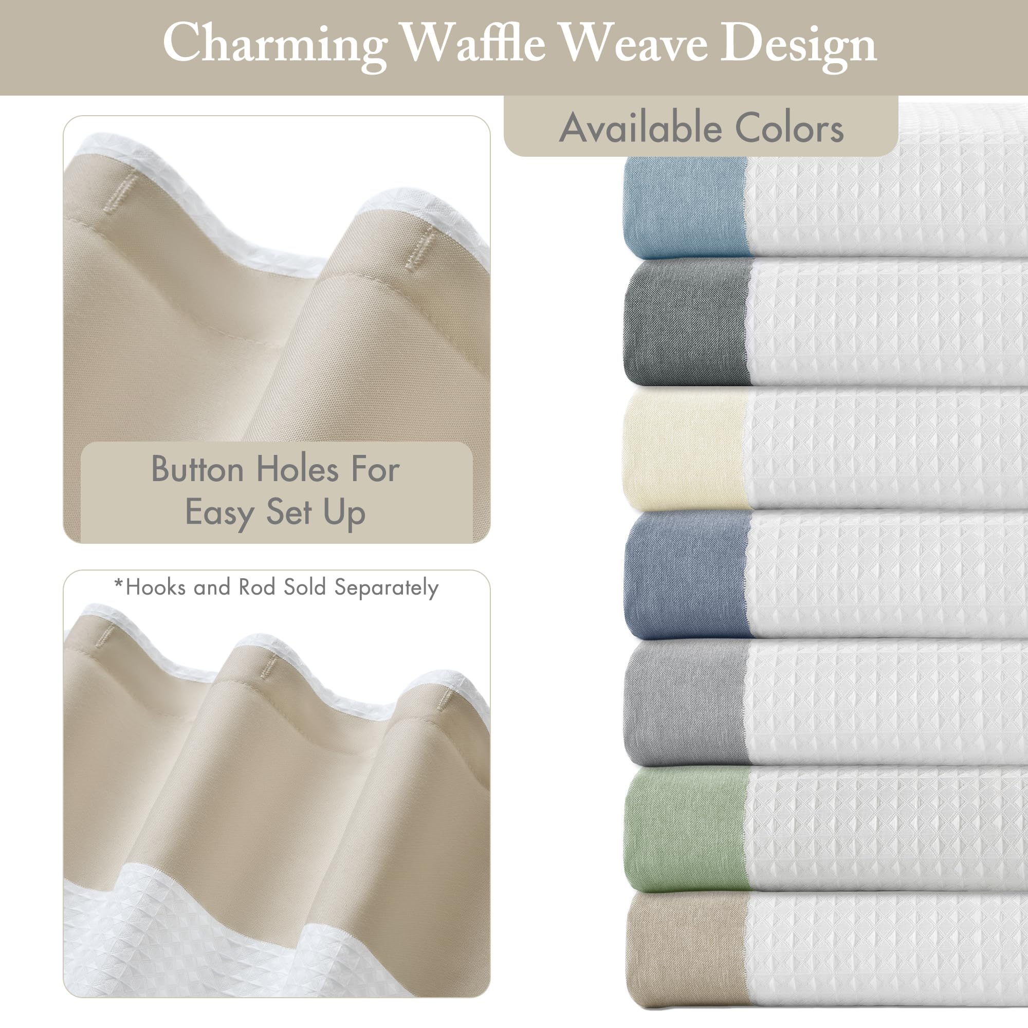 - Privacy and Style: The Spa Waffle farmhouse-style boho shower curtain adds decorative charm while ensuring privacy. For best results, a shower liner is recommended. It features buttonholes for shower hooks (not included)