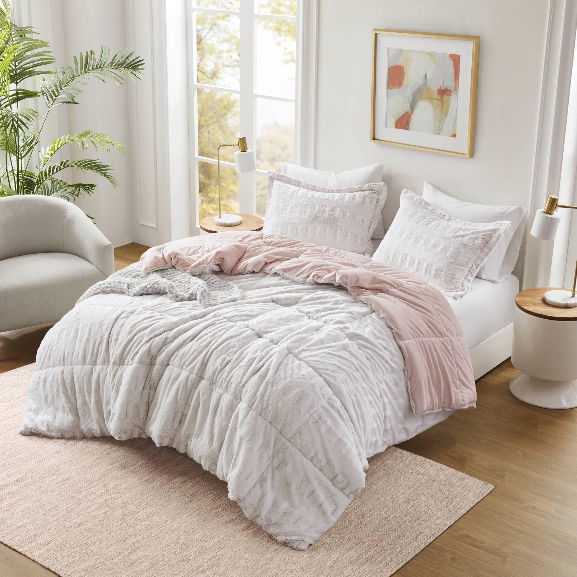 - The ultra-soft blush comforter brushed faux fur on the face that flips to a soft mink reverse, for a luxurious look and feel.