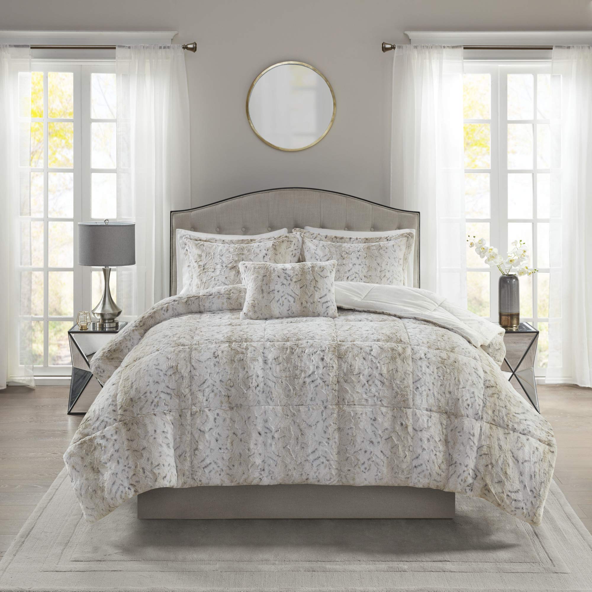 Madison Park Zuri Soft Plush Comforter Set, Faux Fur Animal Stripes Design, Faux Mink On The Reverse, Modern All Season Bedding Set with Matching Sham, King, Snow Leopard 4 Piece